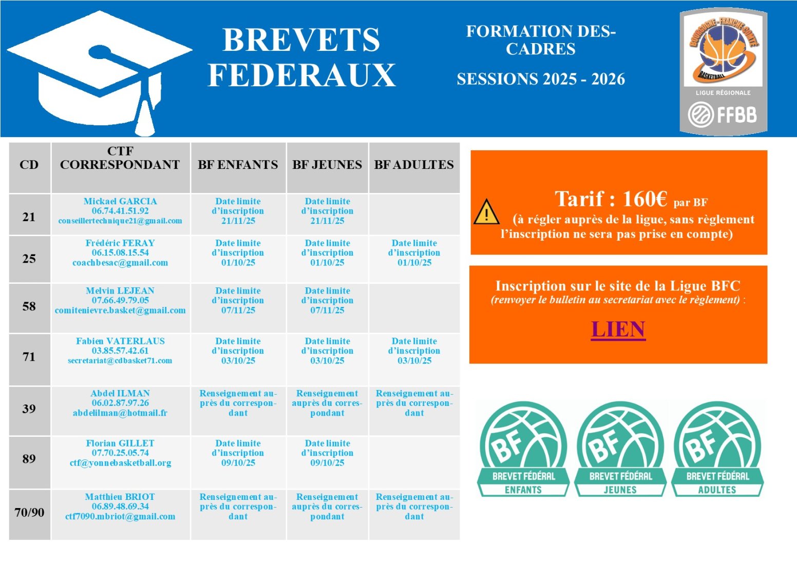 Les inscriptions et leur règlement des Brevets Fédéraux sont centralisés par la Ligue Bourgogne Franche-Comté.